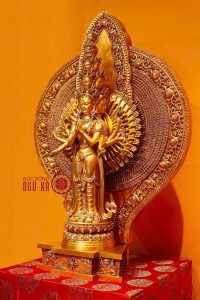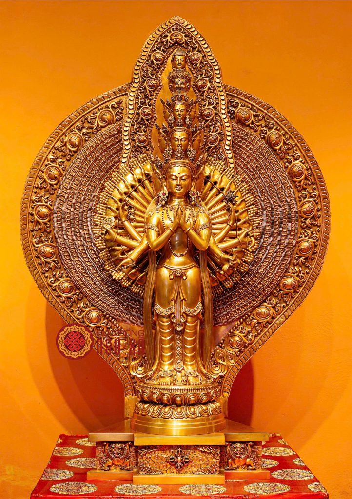 Tượng Đức Phật Thiên Thủ Thiên Nhãn – Quan Âm Ngàn Tay Ngàn Mắt – là biểu tượng tối thượng của từ bi và trí tuệ trong Phật giáo. Hình tượng ngàn tay vươn ra khắp mười phương, mỗi tay lại có một con mắt trí tuệ, biểu trưng cho khả năng thấy khổ đau và cứu độ vô lượng chúng sinh. Tác phẩm được đúc thủ công từ đồng nguyên chất, chạm khắc tinh xảo, từng đường nét uy nghiêm và thanh tịnh, mang đến cảm giác an yên ngay từ ánh nhìn đầu tiên.